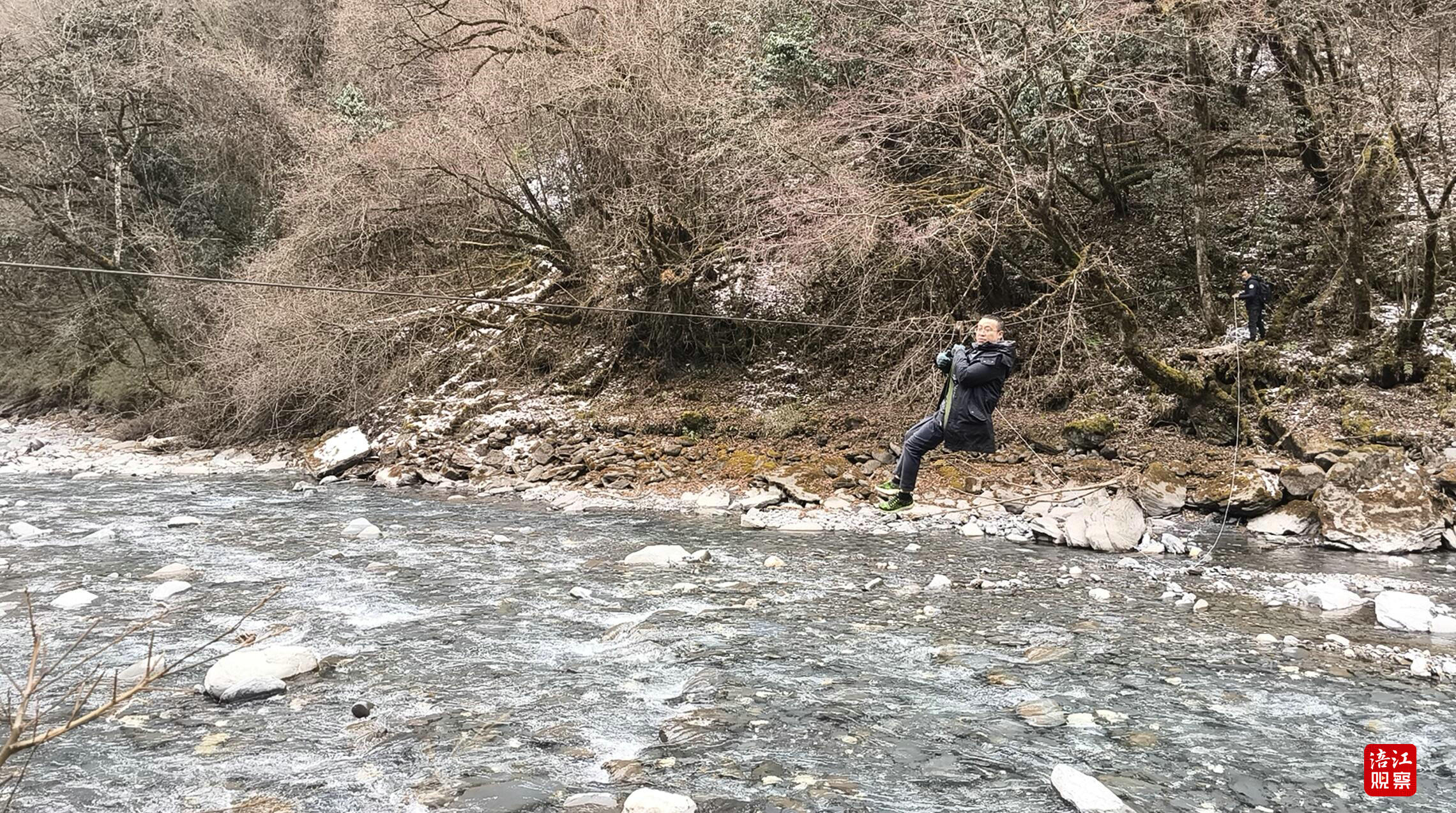 两岸树木间,两条钢溜索凌空飞架。老队员麻利地挂好滑轮,协助汉族巡护员小伙刘敏上索,“别往后仰,手别摸钢绳。”前辈叮嘱。