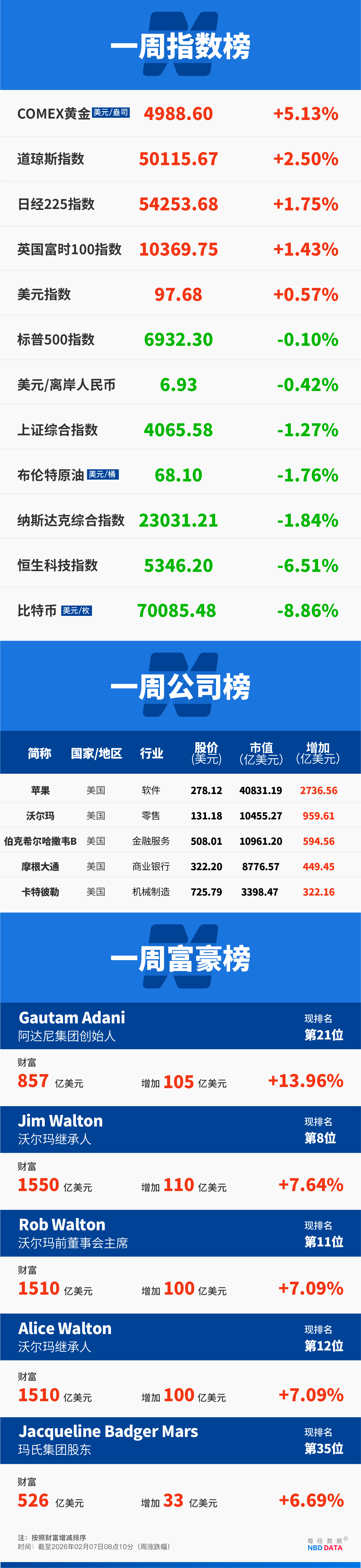 本周,美股三大指数呈深V字型走势,连跌3天后,在周五迎来抄底资金涌入。最终,纳指周跌1.84%,标普500指数周跌0.10%,道指周五首次迈过5万大关,报50115.67点,一周累涨2.5%。