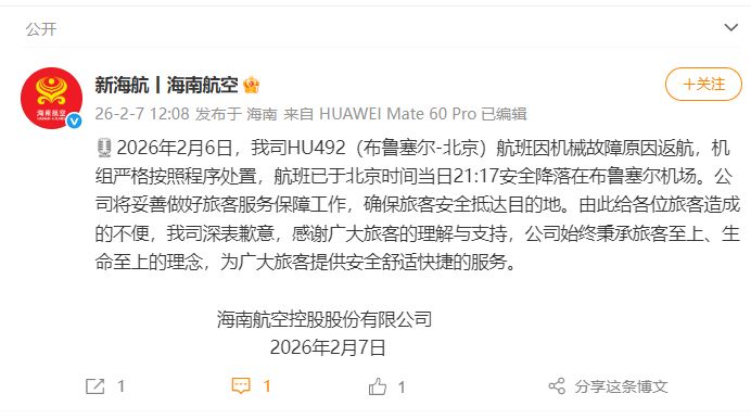 2月7日,海南航空在官方微博发文:2026年2月6日,我司HU492(布鲁塞尔-北京)航班因机械故障原因返航,机组严格按照程序处置,航班已于北京时间当日21:17安全降落在布鲁塞尔机场。公司将妥善做好旅客服务保障工作,确保旅客安全抵达目的地。由此给各位旅客造成的不便,我司深表歉意,感谢广大旅客的理解与支持,公司始终秉承旅客至上、生命至上的理念,为广大旅客提供安全舒适快捷的服务。