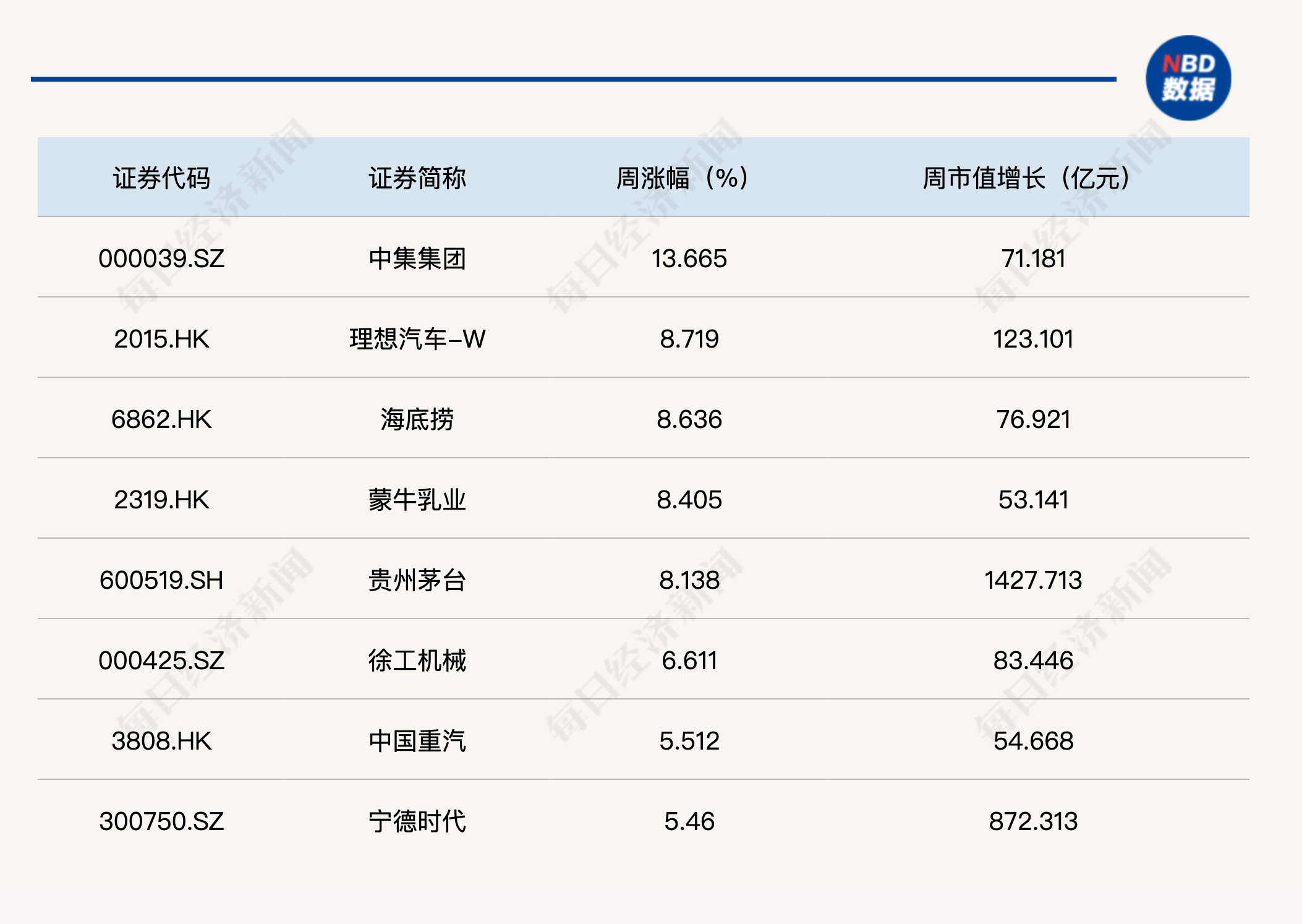 虽然指数出现回调,但本周有超过一半的每经品牌100指数成分股实现上涨。其中,中集集团周涨幅达到13.67%,理想汽车等7只成分股周涨幅也均超过5%。周市值表现方面,贵州茅台本周市值增长超过千亿元,达到1427.71亿元,市值增长较大。