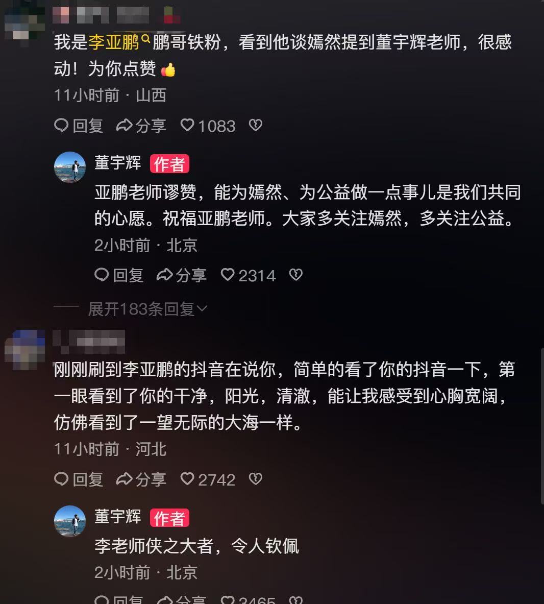 此前,嫣然天使儿童医院因拖欠租金面临关停,李亚鹏在2026年2月4日的年会发言中哽咽透露:在各方的关怀和支持下,嫣然应该可以度过这个难关,在事件发酵初期(1月20日前)便已完成大额捐款,管虎、梁静、那英、与辉同行董宇辉等人均为首批响应者。