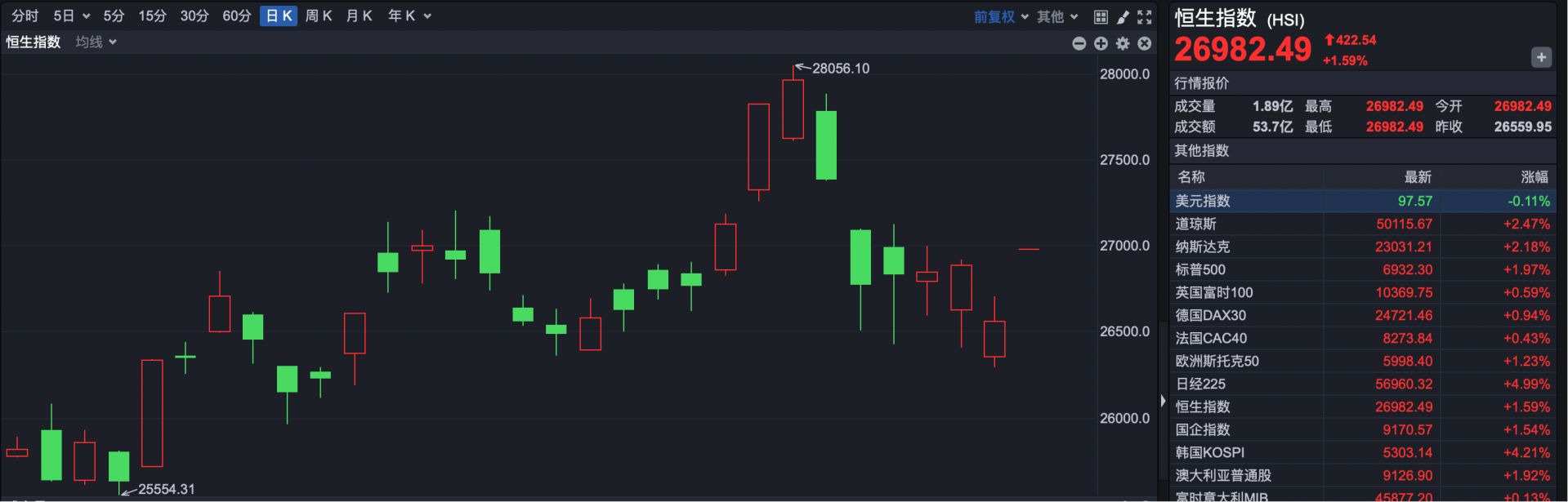 截至发稿,恒生指数开盘报26982.49点,上涨422.54点,涨幅1.59%。