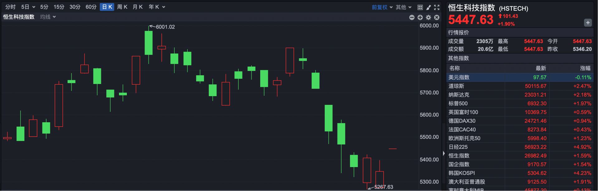 恒生科技指数开盘报5447.63点,上涨101.43点,涨幅1.90%。