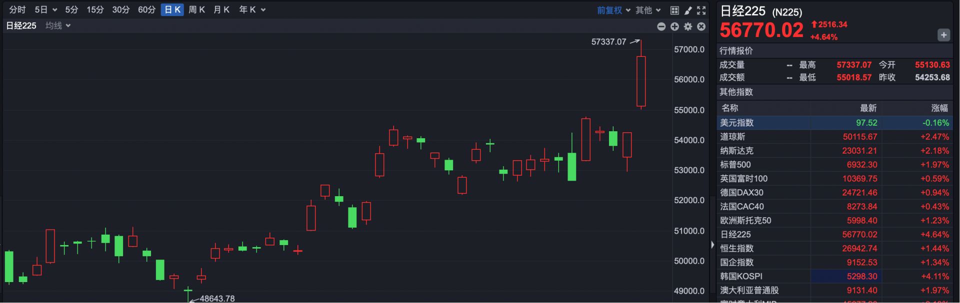 消息面,今日早间,日韩股市大涨,对中国港股市场形成正面刺激。其中,日经225指数盘中一度上涨5.6%,至57337点,创出历史新高。