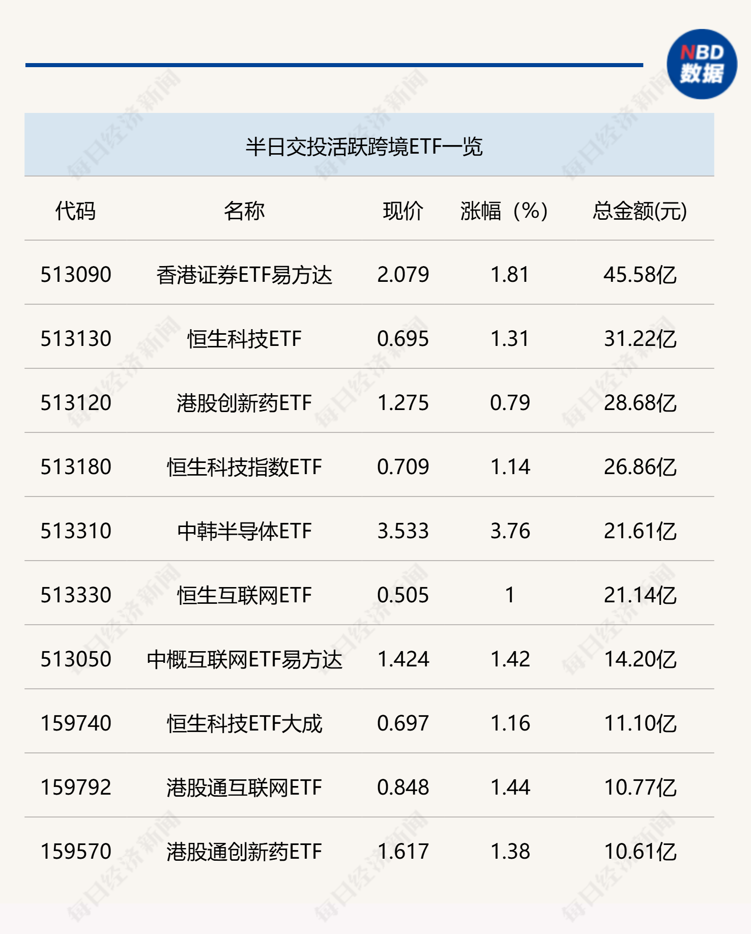 今日上午,行业、主题ETF交投依旧平淡,科创芯片(588200)半日成交金额为18.61亿元,交易金额最大;跨境ETF方面,香港证券ETF易方达(513090)半日成交金额为45.58亿元,交投相对活跃。