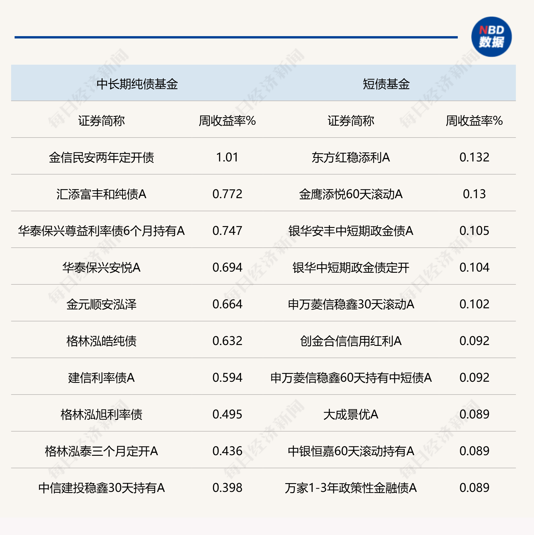 说明:上周各类公募债基头部业绩产品统计 来源:Wind