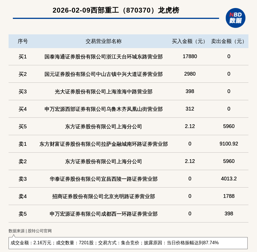 每经讯,2026年2月9日,新三板创新层公司西部重工(870370,收盘价:2.12元)登上龙虎榜,交易方式是集合竞价,披露原因是当日价格振幅达到87.74%,成交数量7201股,成交金额2.16万元。买一席位为国泰海通证券股份有限公司浙江天台环城东路营业部,买入1.79万元;卖一席位为东方财富证券股份有限公司拉萨金融城南环路证券营业部,卖出9100.92元。