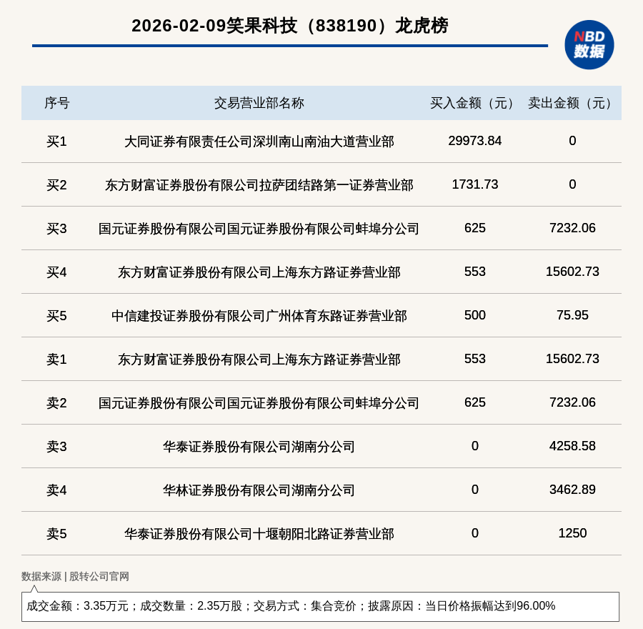 每经讯,2026年2月9日,新三板创新层公司笑果科技(838190,收盘价:1.43元)登上龙虎榜,交易方式是集合竞价,披露原因是当日价格振幅达到96.00%,成交数量2.35万股,成交金额3.35万元。买一席位为大同证券有限责任公司深圳南山南油大道营业部,买入3万元;卖一席位为东方财富证券股份有限公司上海东方路证券营业部,卖出1.56万元。
