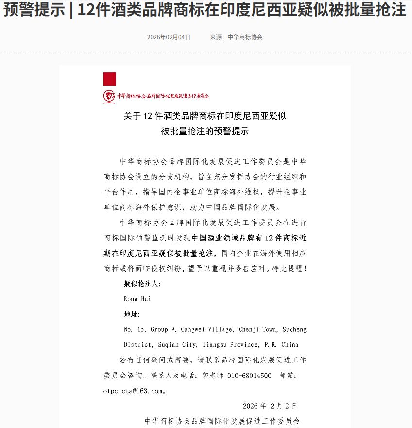 2月4日,中华商标协会品牌国际化发展促进工作委员会发布预警提示,该委员会在进行商标国际预警监测时发现,中国酒业领域品牌有12件商标近期在印度尼西亚疑似被批量抢注,国内企业在海外使用相应商标或将面临侵权纠纷,望予以重视并妥善应对。