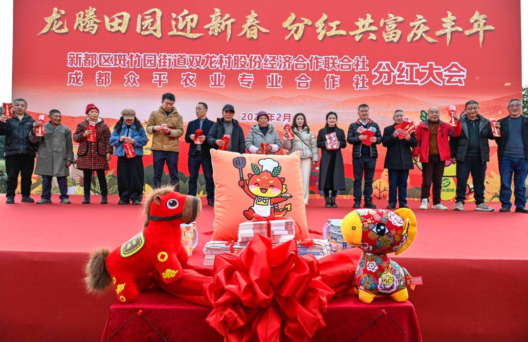 2月4日,成都市新都区斑竹园街道双龙村漫野音乐营地的草坪上,双龙村2026年分红大会正式开始。大红的对联、喜庆的福字、欢快的音乐、热闹的游戏,还有堆成小山的40余万元现金,让整个村子的村民脸上都洋溢着喜色。