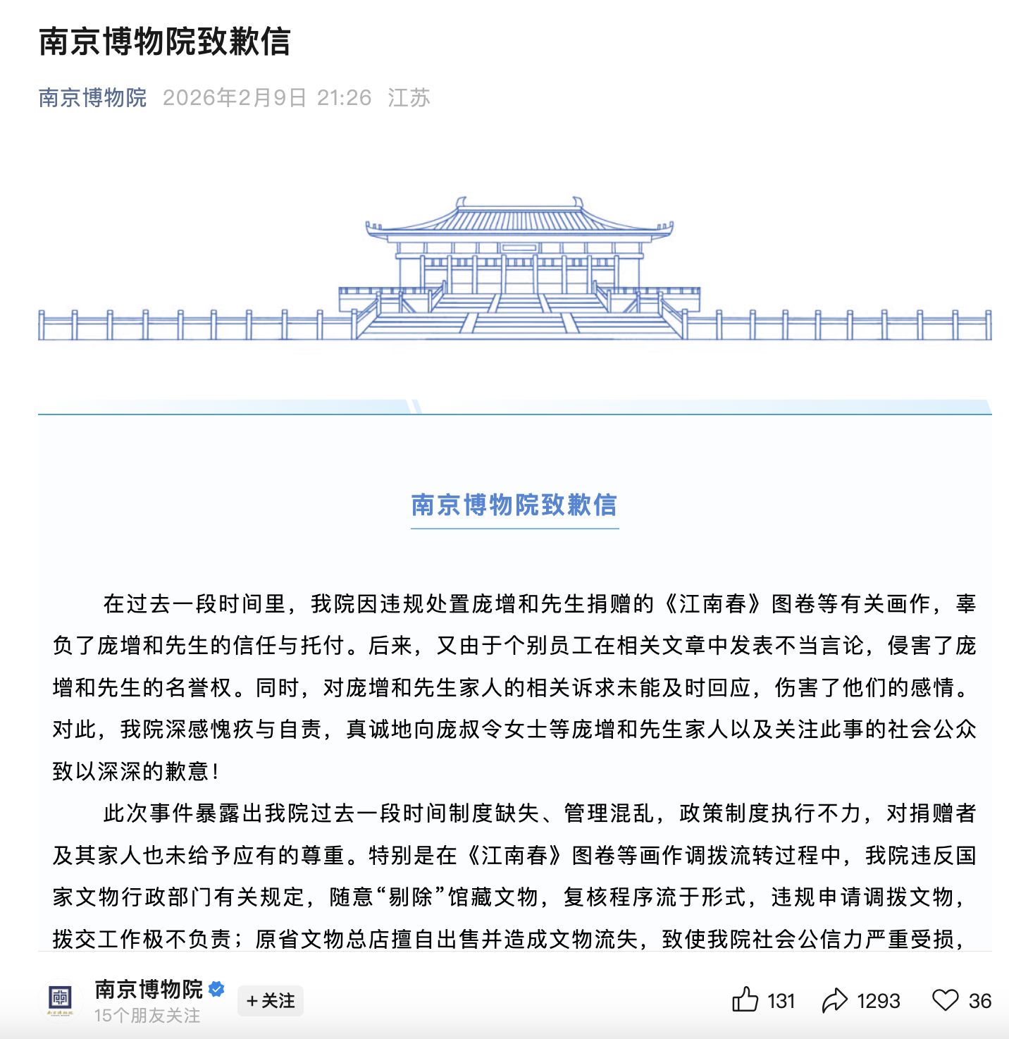 2月9日晚,南京博物院发布道歉信,具体如下:
