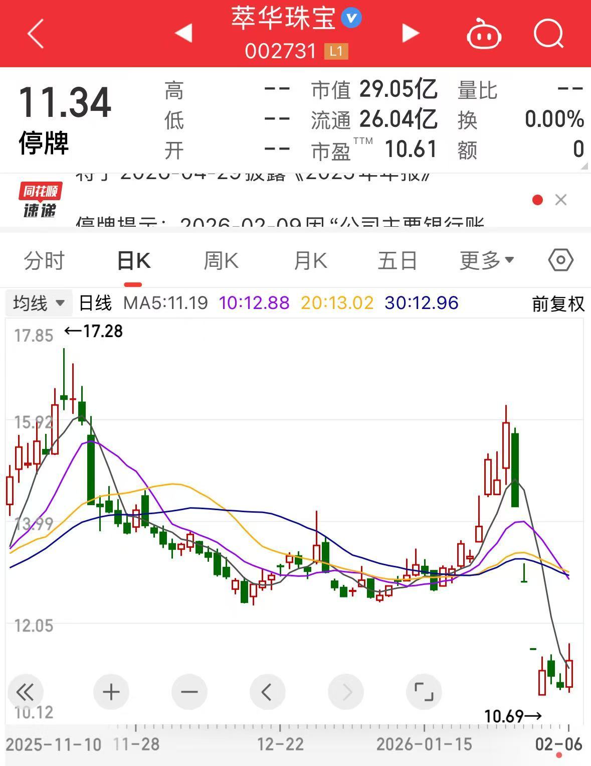 市场方面,萃华珠宝近期股价跌幅较大。1月29日至2月2日,公司股价曾连续3日跌停。