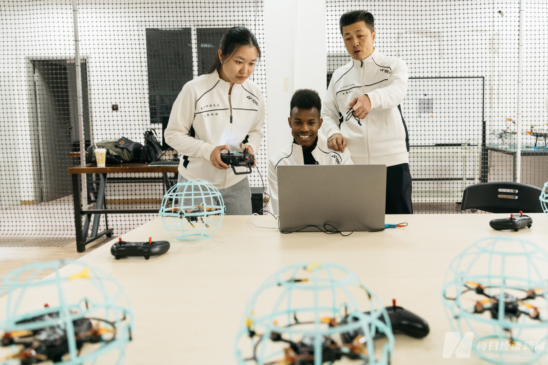 比赛胶着的关键时刻,王安操控着无人机,通过和其他队友的全中文战术沟通,在队友们的密切配合下,突破了对方防线,精准射门,引发全场欢呼。同时,罗恩玲的防守技战术也获得了队友们的称赞。队伍在开赛首日取得了两连胜,顺利进入复赛。