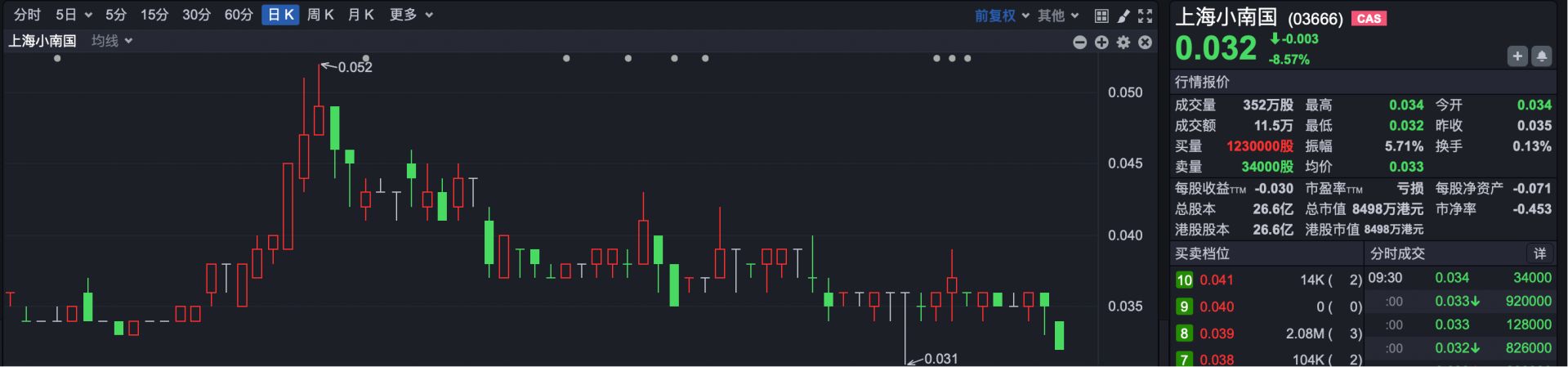 上海小南国(HK03666)早盘跌超8%,当前市值不足1亿港元。
