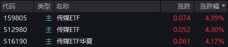 受盘面影响,传媒ETF涨超4%。