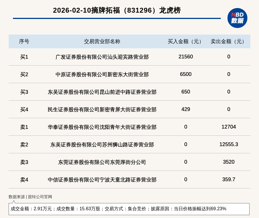 每经讯,2026年2月10日,新三板基础层公司摘牌拓福(831296,收盘价:0.13元)登上龙虎榜,交易方式是集合竞价,披露原因是当日价格振幅达到69.23%,成交数量15.63万股,成交金额2.91万元。买一席位为广发证券股份有限公司汕头迎宾路营业部,买入2.16万元;卖一席位为华泰证券股份有限公司沈阳青年大街证券营业部,卖出1.27万元。