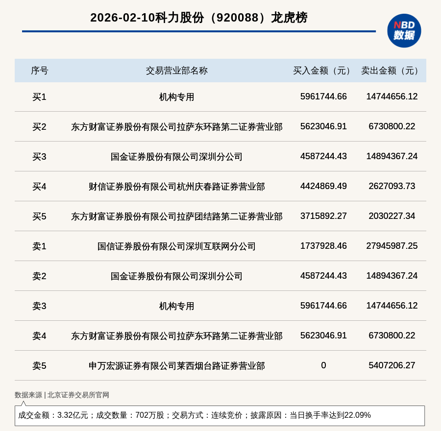 每经讯,2026年2月10日,北交所上市公司科力股份(920088,收盘价:45.91元)登上龙虎榜,交易方式是连续竞价,披露原因是当日换手率达到22.09%,成交数量702万股,成交金额3.32亿元。买一席位为机构专用,买入596.17万元;卖一席位为国信证券股份有限公司深圳互联网分公司,卖出2794.6万元。