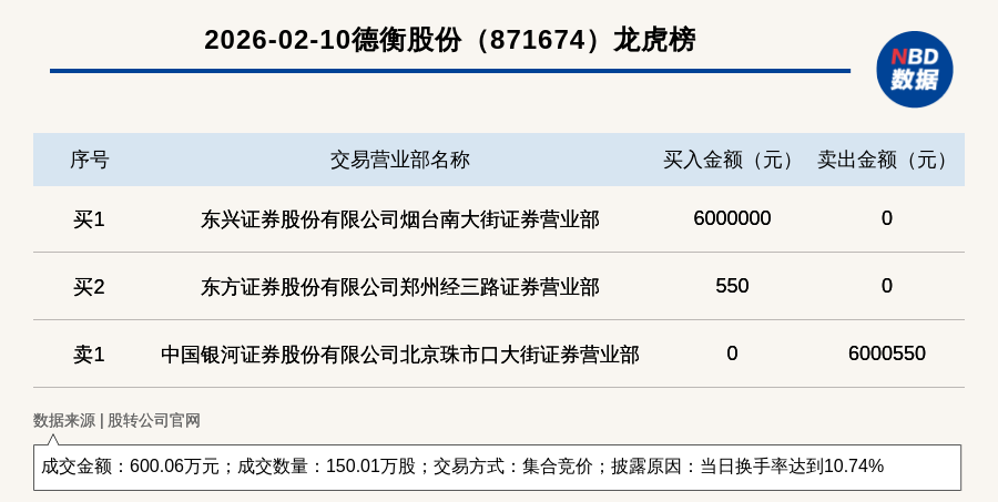 每经讯,2026年2月10日,新三板创新层公司德衡股份(871674,收盘价:5.5元)登上龙虎榜,交易方式是集合竞价,披露原因是当日换手率达到10.74%,成交数量150.01万股,成交金额600.06万元。买一席位为东兴证券股份有限公司烟台南大街证券营业部,买入600万元;卖一席位为中国银河证券股份有限公司北京珠市口大街证券营业部,卖出600.06万元。