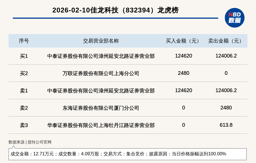 每经讯,2026年2月10日,新三板创新层公司佳龙科技(832394,收盘价:6.2元)登上龙虎榜,交易方式是集合竞价,披露原因是当日价格振幅达到100.00%,成交数量4.09万股,成交金额12.71万元。买一席位为中泰证券股份有限公司漳州延安北路证券营业部,买入12.46万元;卖一席位为中泰证券股份有限公司漳州延安北路证券营业部,卖出12.4万元。