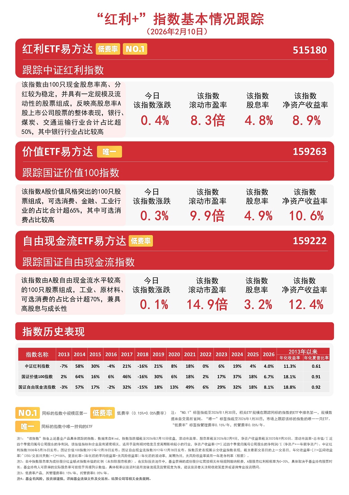 国证价值100指数采用“高分红+高自由现金流+低市盈率”三维筛选体系,优选价值标的,历史表现稳健;国证自由现金流指数则采用自由现金流率进行选样,兼具高股息与成长性。价值ETF易方达(159263)和自由现金流ETF易方达(159222)分别跟踪以上指数,可助力投资者把握相关风格投资机遇。