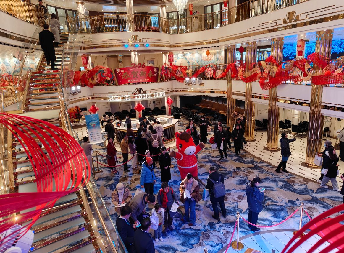 2月8日,爱达广场内,4000多名宾客陆续上船。正在换取房卡的施先生向《每日经济新闻》记者表示,邮轮旅行省心省力,特别适合像他这样一家五口的家庭出游。相比于目的地,他更期待体验邮轮上的敦煌文化,现在的票价也更具性价比。