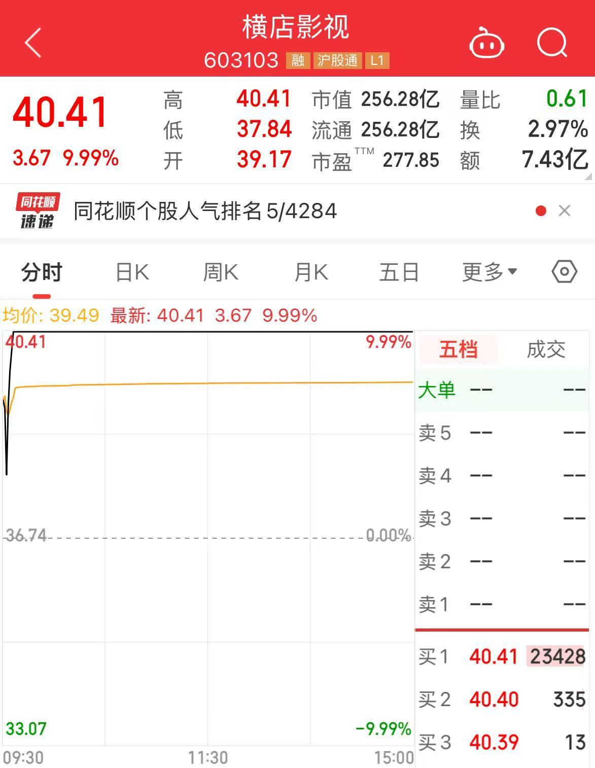 二级市场上,横店影视近9个交易日斩获7个涨停板,最新股价报40.41元/股,总市值为256.28亿元。