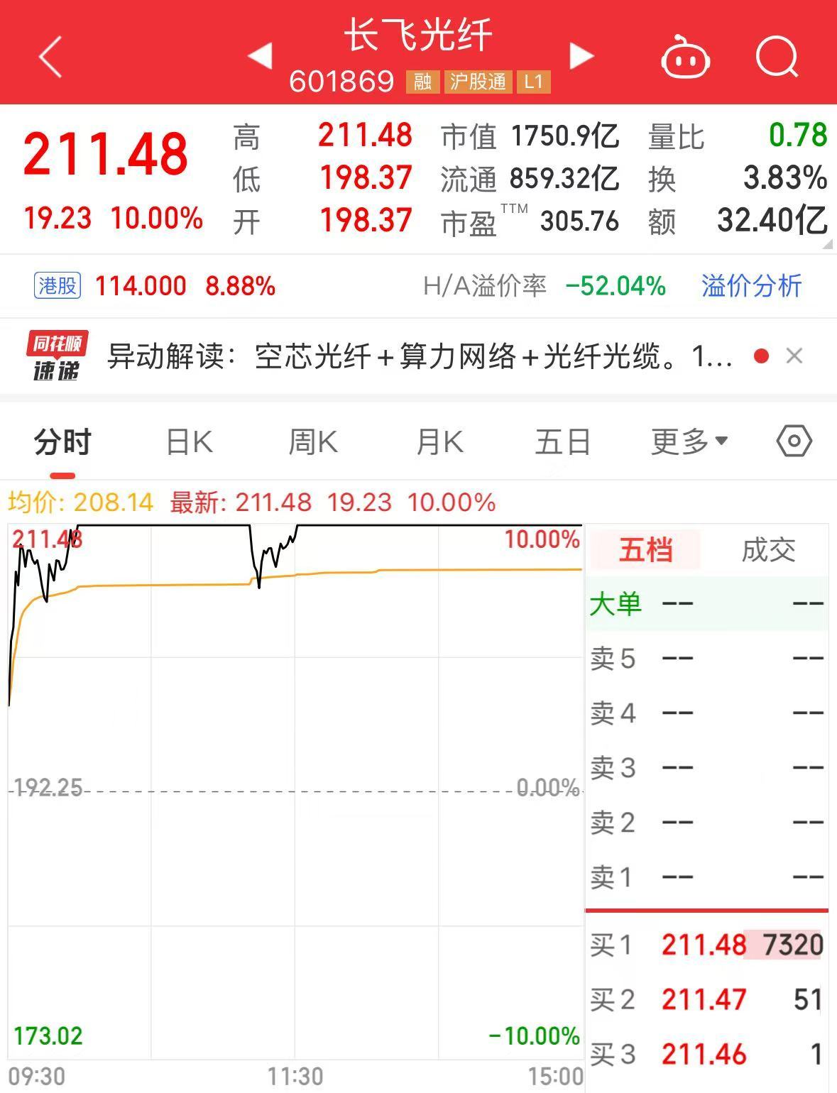 截至2月10日收盘,长飞光纤再度涨停,最新股价已突破200元/股。至此,该股近12个交易日已累计涨近90%。