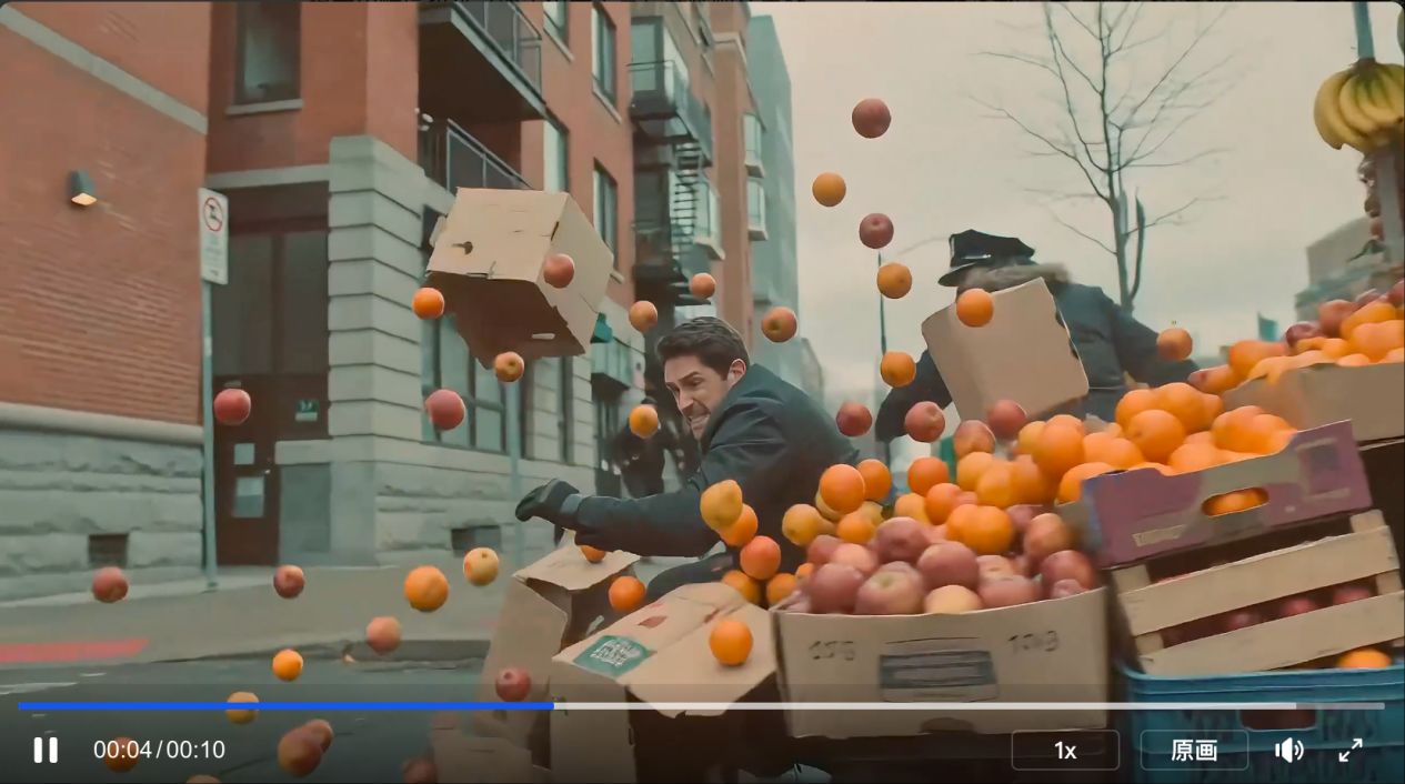 《每日经济新闻》记者也选择了一条Seedance 2.0的官方提示词(黑衣男子逃跑被追打翻水果摊)输入可灵3.0。从生成效果来看,可灵3.0对人物主体的描述、镜头切换的处理以及动作衔接、画面声音的呈现是可圈可点的。但Seedance 2.0的示例视频则明确呈现出了创作设计后的产生“电影感叙事”。(不排除官方视频进行了抽卡和定向训练)
