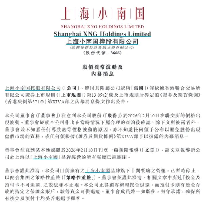 上海小南国在公告中称,董事会注意到某本地媒体于2026年2月10日刊登一篇新闻报道,该报道指出公司于上海以“上海小南国”品牌经营的所有餐厅已经关闭。