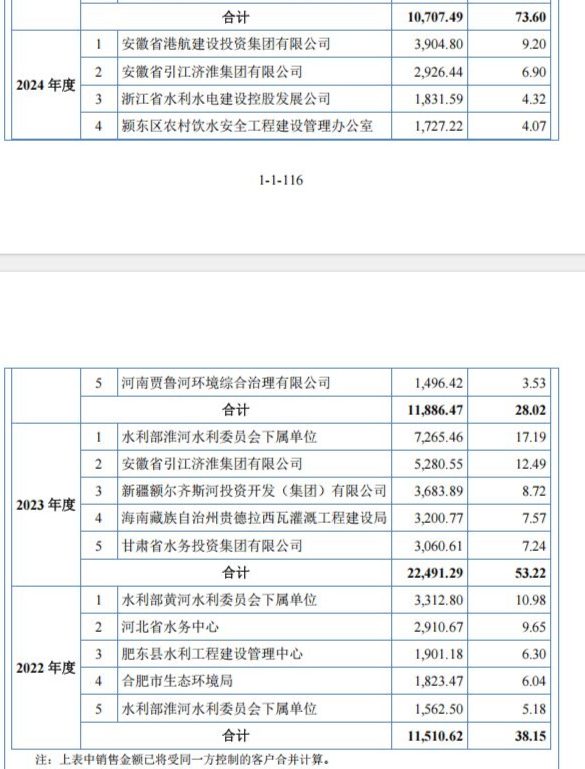 这种业务模式,注定了客户关系具有脆弱性。报告期内公司的客户名单变动频繁。例如2022年,水利部黄河水利委员会下属单位位居公司第一大客户,但2023年从公司前五大客户名单中消失;2023年水利部淮河水利委员会下属单位为公司第一大户,2024年从公司前五大客户名单中消失。