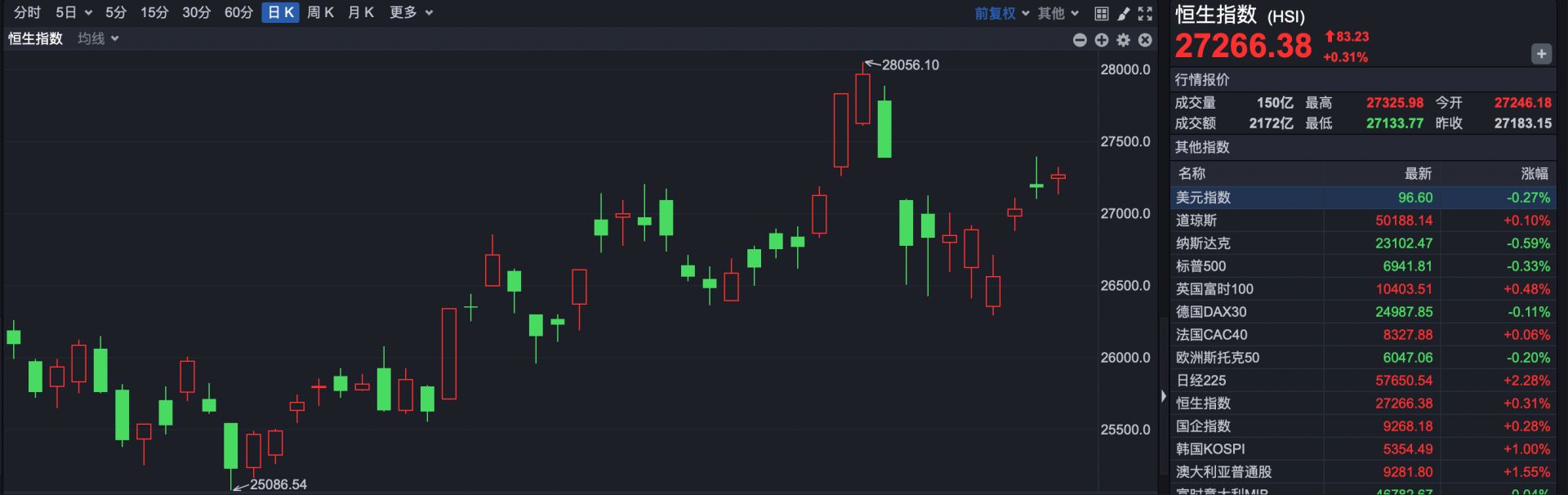 截至收盘,恒生指数报27266.38点,上涨83.23点,涨幅0.31%。