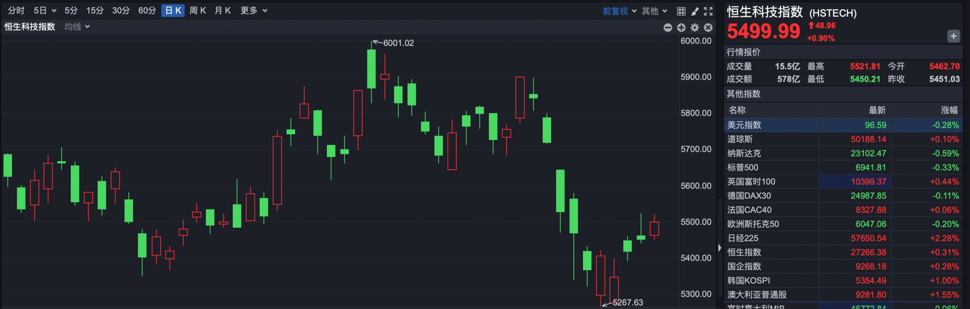 恒生科技指数收盘报5499.99点,上涨48.96点,涨幅0.90%。