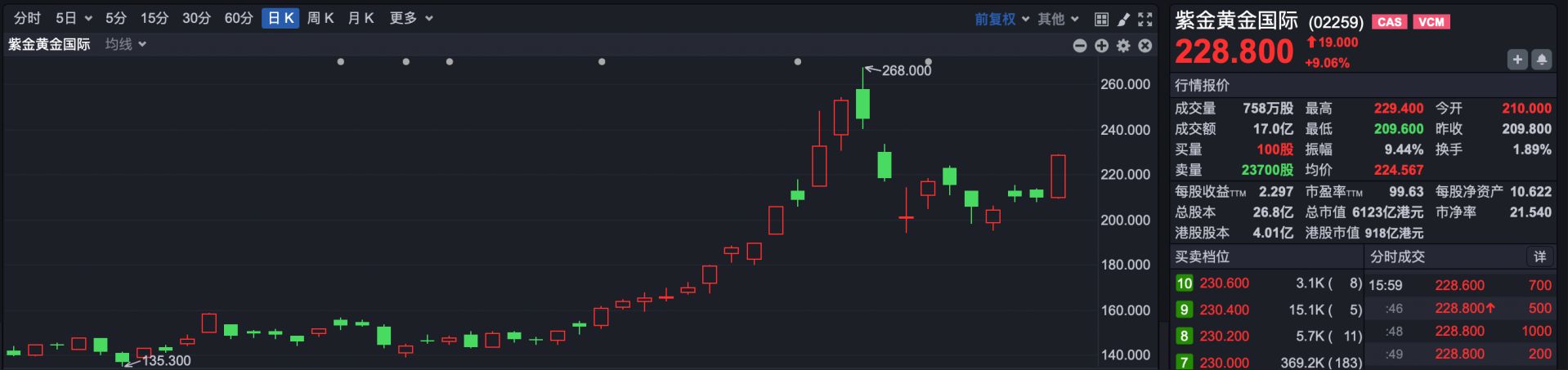 市场热点方面,经过前期调整之后,黄金股再次走强。截至收盘,紫金黄金国际(HK02259)涨超9%,灵宝黄金涨超6%,山东黄金涨超4%,紫金矿业涨超3%。