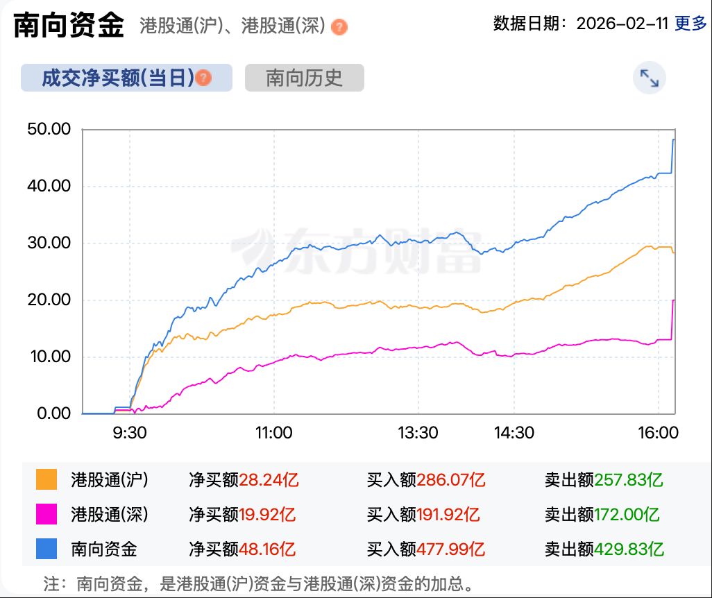 资金方面,截至收盘,南向资金净买入港股超48亿港元。