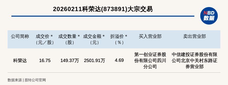 每经讯,2026年2月11日,新三板创新层公司科荣达(873891,收盘价:16元)发生一笔大宗交易,成交价16.75元/股,成交数量149.37万股,成交金额2501.91万元,溢价4.69%。买入营业部是第一创业证券股份有限公司四川分公司,卖出营业部是中信建投证券股份有限公司北京中关村东路证券营业部。