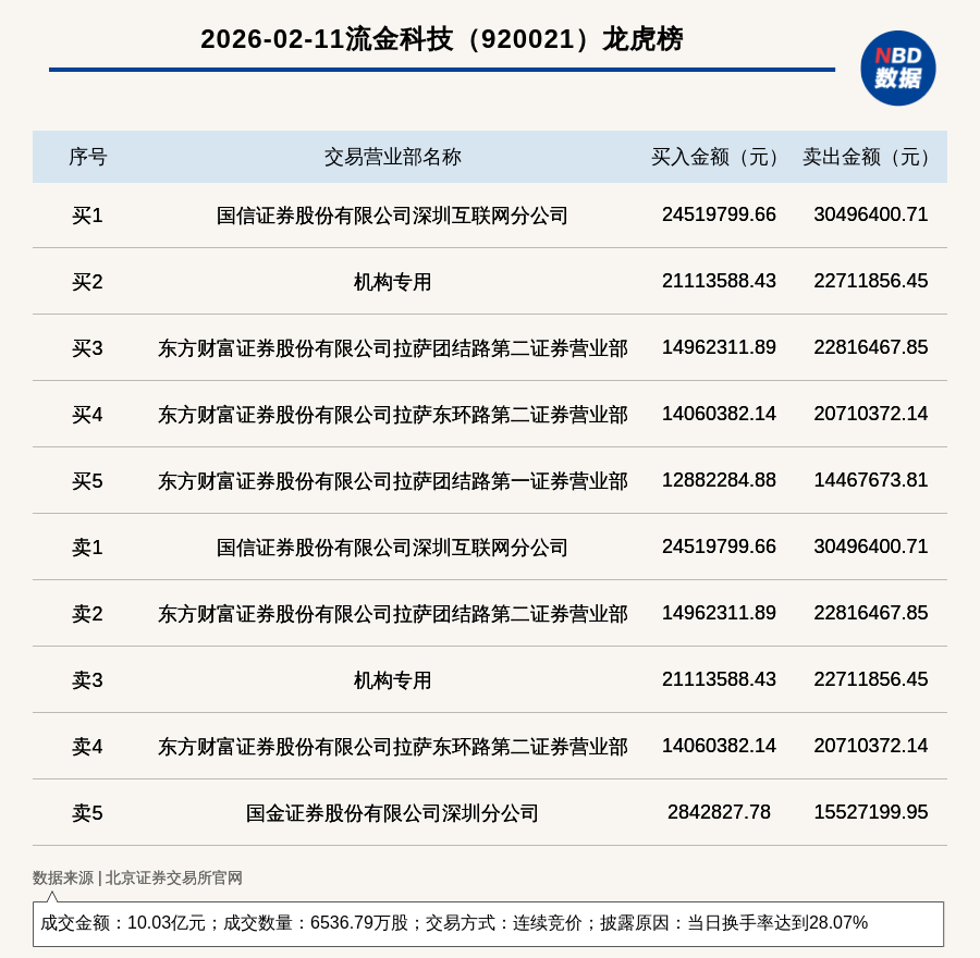 每经讯,2026年2月11日,北交所上市公司流金科技(920021,收盘价:15.33元)登上龙虎榜,交易方式是连续竞价,披露原因是当日换手率达到28.07%,成交数量6536.79万股,成交金额10.03亿元。买一席位为国信证券股份有限公司深圳互联网分公司,买入2451.98万元;卖一席位为国信证券股份有限公司深圳互联网分公司,卖出3049.64万元。
