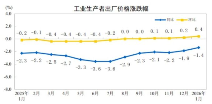 冯琳分析,首先,从国内市场供需结构来看,一方面,1月“反内卷”政策持续推进,带动相关行业供需结构改善及出厂价格修复,当月光伏设备及元器件制造、基础化学原料制造和钢铁行业PPI环比均止跌回正,分别上涨1.9%、0.7%和0.2%,汽车制造业PPI环比也由上月的下跌0.1%改善至持平;另一方面,部分行业需求增加推动价格上涨,其中,伴随春节临近,节前消费需求带动工艺美术及礼仪用品制造、农副食品加工业PPI分别上涨4.1%和0.3%,涨幅较上月分别加快1.9和0.5个百分点,AI算力需求增长带动计算机通信和其他电子设备制造业价格环比上涨0.5%,涨幅较上月加快0.6个百分点。其次,从国际输入性因素看,尽管1月国际油价反弹尚未充分向国内传导,但国际有色金属价格延续强势,带动国内有色金属行业价格加速上涨,对当月PPI环比也起到明显拉升作用。1月有色金属矿采选业、有色金属冶炼和压延加工业PPI环比分别上涨5.7%和5.2%,涨幅较上月加快2.0和2.4个百分点,其中银冶炼、铜冶炼、金冶炼、铝冶炼价格分别上涨38.2%、8.4%、4.8%和2.3%,除金冶炼价格涨幅与上月持平外,银、铜、铝冶炼价格涨幅较上月分别加快24.7、3.8和1.4个百分点。