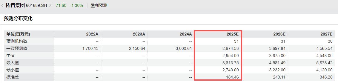 Wind金融终端汇编的数据显示,31家机构对拓普集团2025年归母净利润的预测最小值为27.4亿元、最大值约36.14亿元、一致预测值约29.75亿元。因此,按照公司给出的26亿元~29亿元预测区间来看,是不及机构预期的。