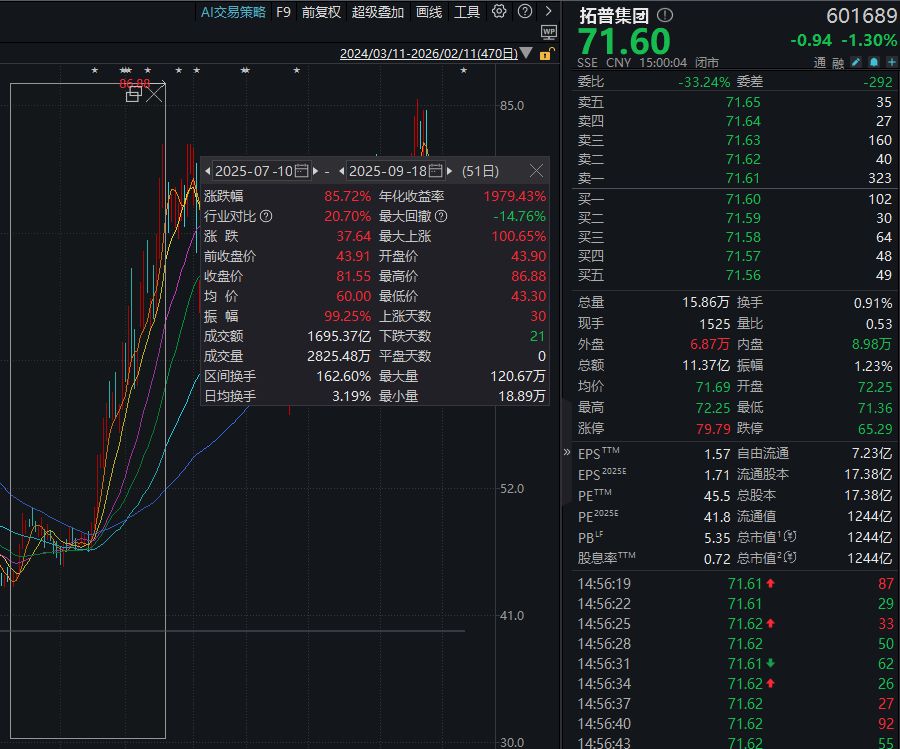 《每日经济新闻》记者注意到,受益于人形机器人概念,拓普集团股价在2025年曾走出过一波大行情——Wind数据显示,2025年7月10日—9月18日,拓普集团股价在51个交易日内大涨85.72%。