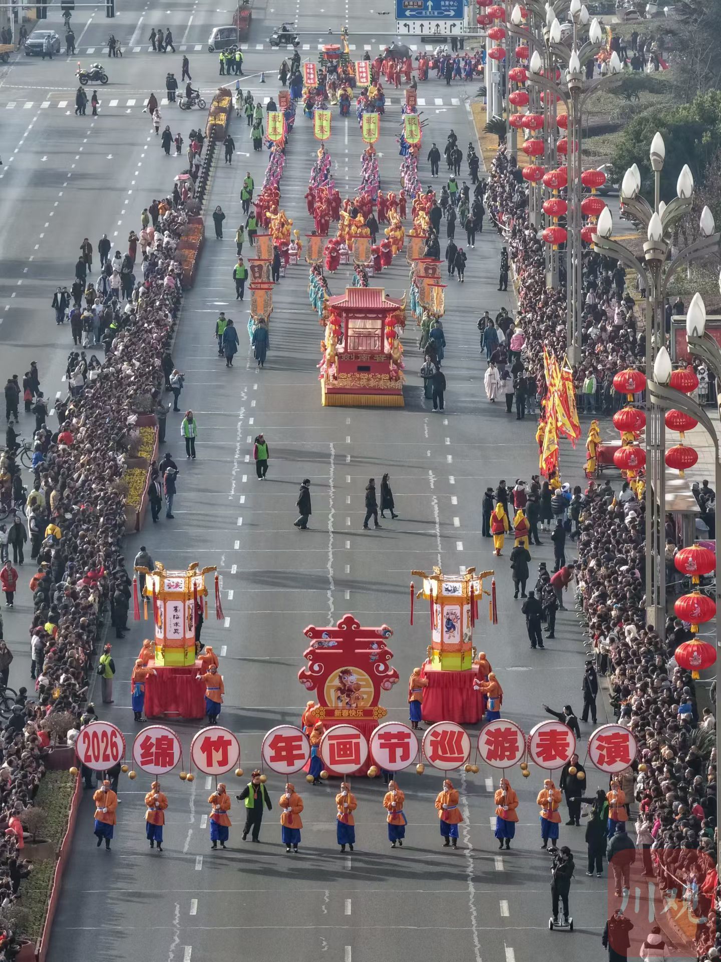 “这是只有在我们绵竹才能体验到的年味!”当天上午开幕的2026年第二十五届绵竹年画节上,一位绵竹市民倍感自豪。在德阳绵竹市体育中心广场前,由1400多名群众演员参与的“画里游春·绵竹寻年”民俗巡游,让清代《迎春图》中的460多个人物“活”起来。