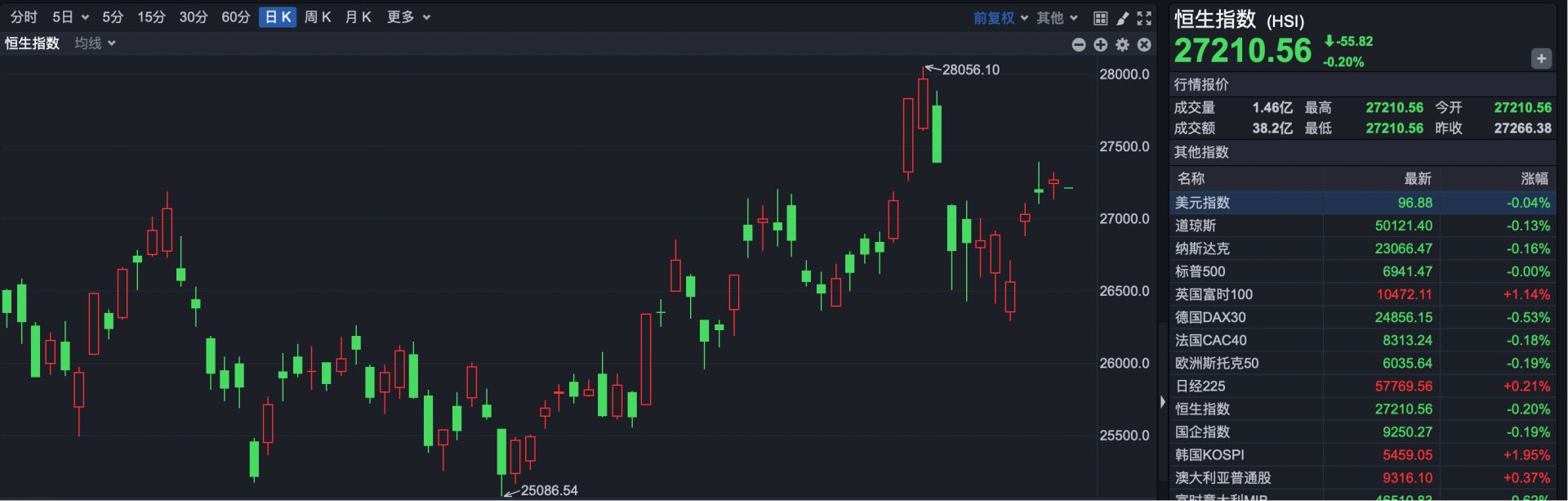 截至发稿,恒生指数开盘报27210.56点,下跌55.82点,跌幅0.20%。