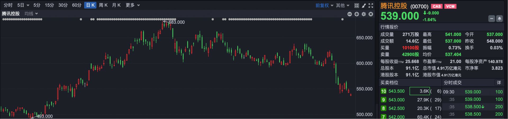 市场焦点方面,腾讯控股(HK00700)低开超2%,最低报537港元,创近半年来新低。新年以来,腾讯累计跌幅超过10%。如果从去年高点683港元算起,腾讯累计最大跌幅超过21%。