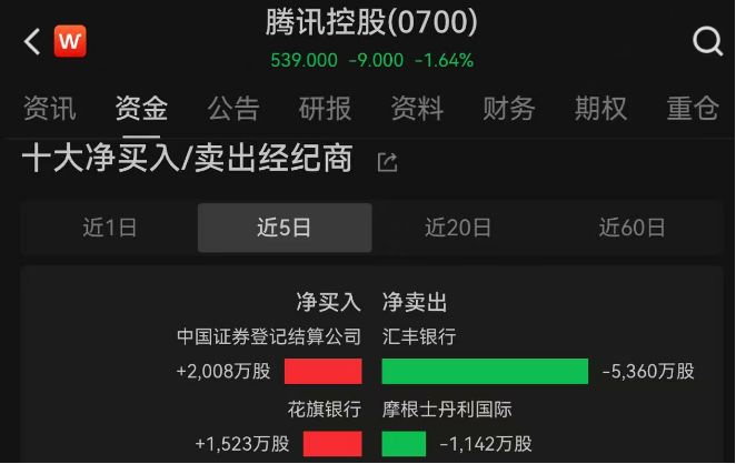 WIND数据显示,近5日,净卖出经纪商前两位分别为汇丰银行净卖出5360万股,摩根士丹利国际净卖出1142万股。