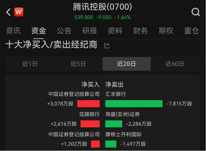 近20日,净卖出经纪商前两位分别为汇丰银行和高盛(亚洲)证券,其中汇丰银行累计净卖出7815万股,高盛(亚洲)证券净卖出2286万股。