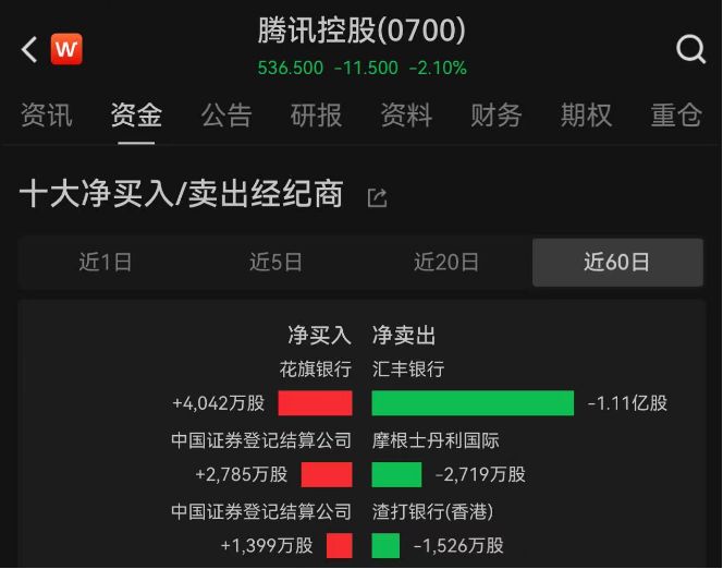 近60日,净卖出最多的经纪商依然是汇丰银行,累计净卖出高达1.11亿股,排名第二的为摩根士丹利国际,累计净卖出2719万股。