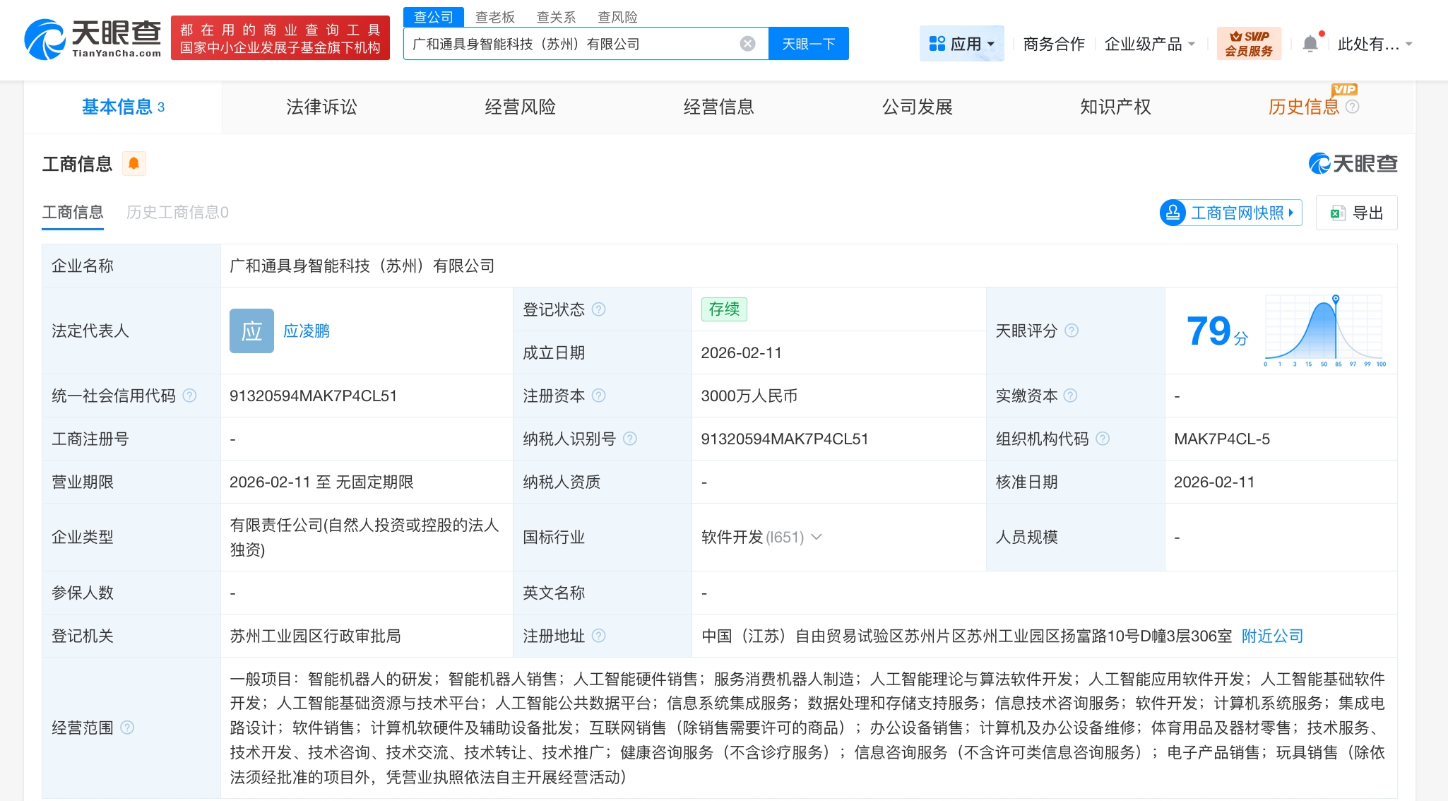 每经AI快讯,天眼查App显示,近日,广和通具身智能科技(苏州)有限公司成立,法定代表人为应凌鹏,注册资本3000万元人民币,经营范围含智能机器人的研发、智能机器人销售、人工智能硬件销售、服务消费机器人制造、人工智能理论与算法软件开发、人工智能应用软件开发、人工智能基础软件开发、信息系统集成服务等。股东信息显示,该公司由广和通(300638)全资持股。