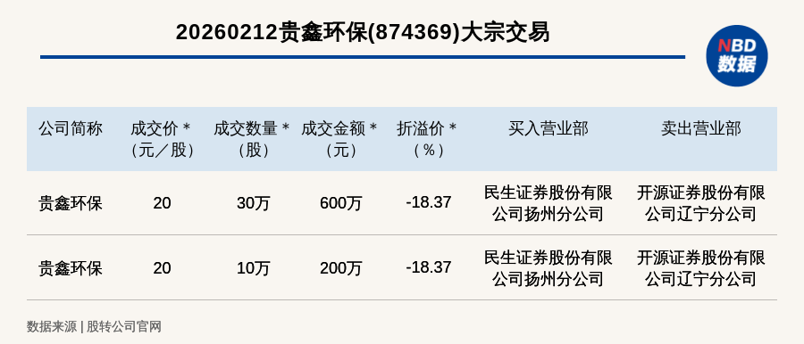 每经讯,2026年2月12日,新三板创新层公司贵鑫环保(874369,收盘价:24.5元)发生2笔大宗交易,总成交金额为800万元,成交金额最高的一笔成交价20元/股,成交数量30万股,成交金额600万元,折价18.37%。买入营业部是民生证券股份有限公司扬州分公司,卖出营业部是开源证券股份有限公司辽宁分公司。