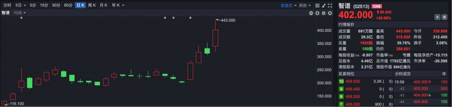 大模型第一股智谱(HK02513)继续高举高打,今日盘中一度涨超40%,尾盘涨幅有所收窄,最终上涨28.86%。