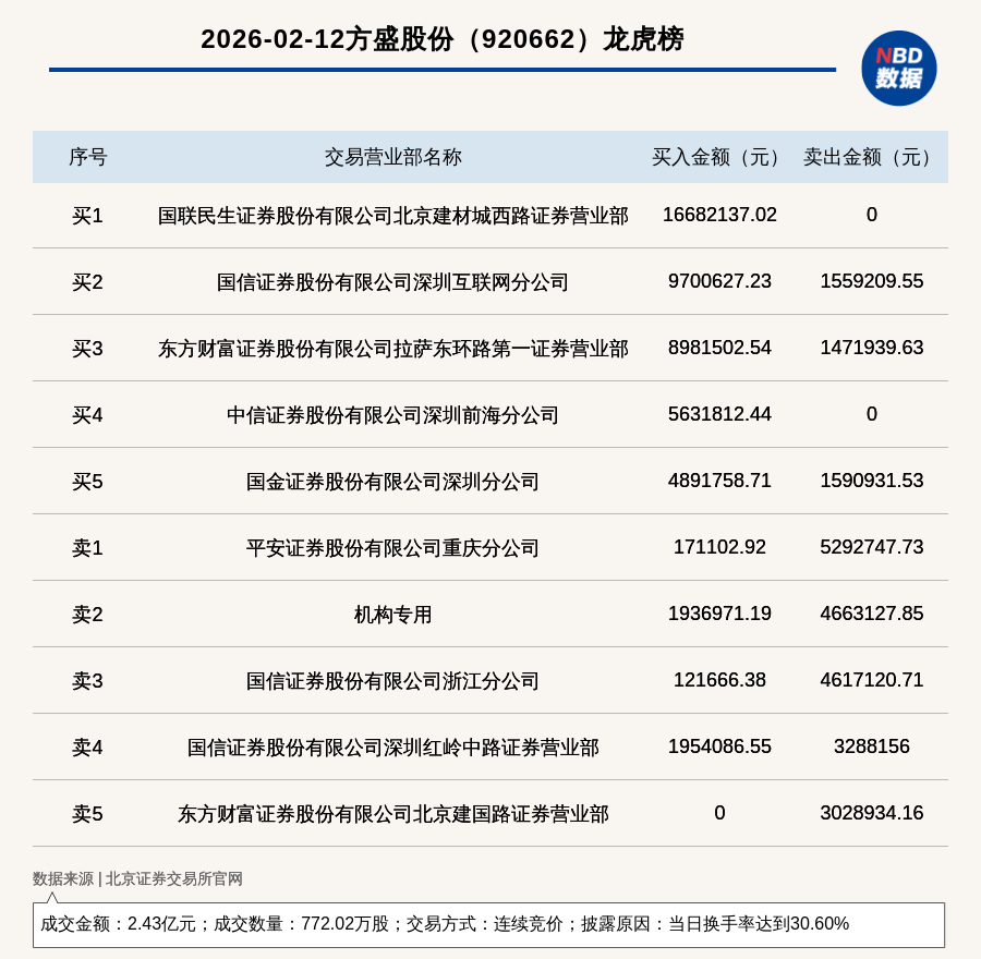 每经讯,2026年2月12日,北交所上市公司方盛股份(920662,收盘价:31.4元)登上龙虎榜,交易方式是连续竞价,披露原因是当日换手率达到30.60%,成交数量772.02万股,成交金额2.43亿元。买一席位为国联民生证券股份有限公司北京建材城西路证券营业部,买入1668.21万元;卖一席位为平安证券股份有限公司重庆分公司,卖出529.27万元。