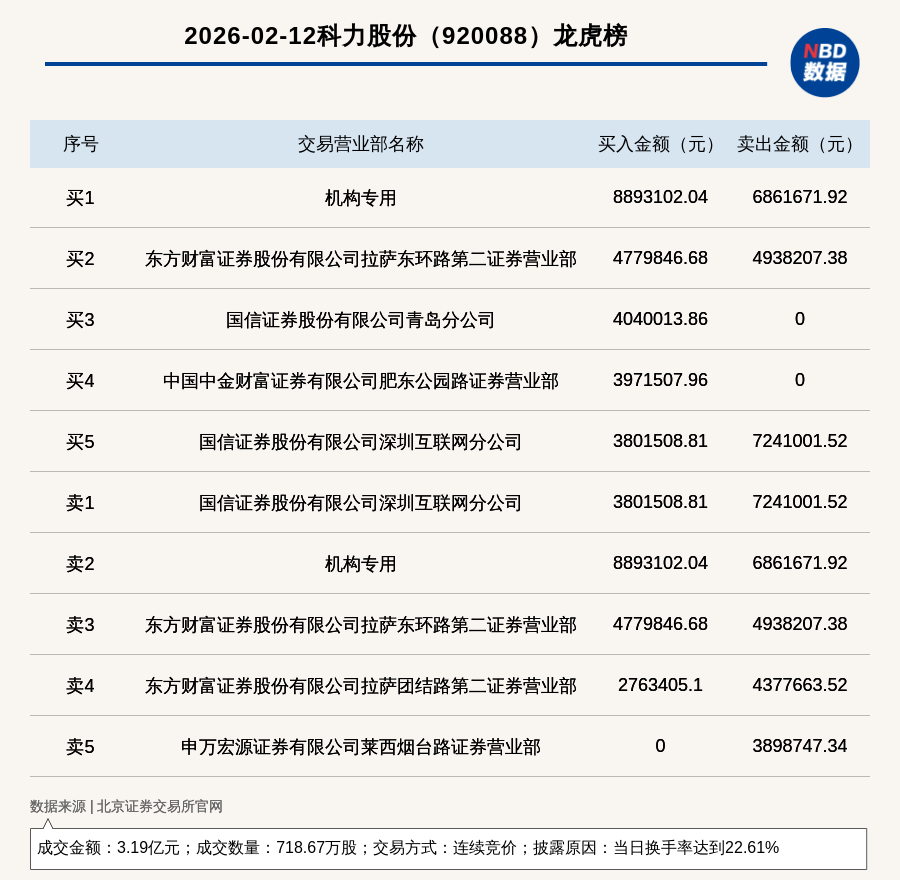 每经讯,2026年2月12日,北交所上市公司科力股份(920088,收盘价:42.91元)登上龙虎榜,交易方式是连续竞价,披露原因是当日换手率达到22.61%,成交数量718.67万股,成交金额3.19亿元。买一席位为机构专用,买入889.31万元;卖一席位为国信证券股份有限公司深圳互联网分公司,卖出724.1万元。